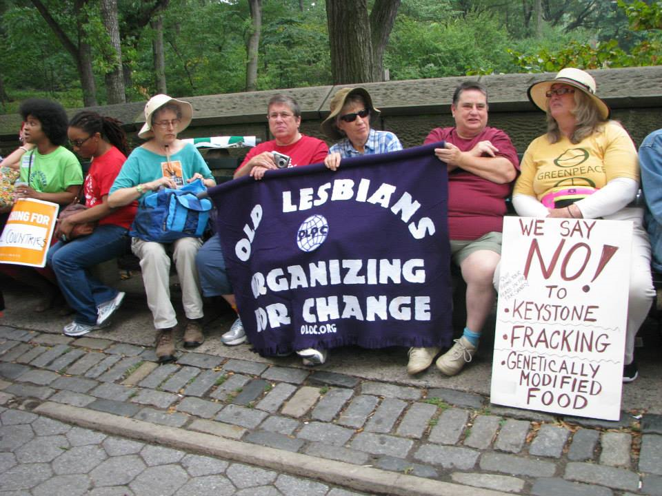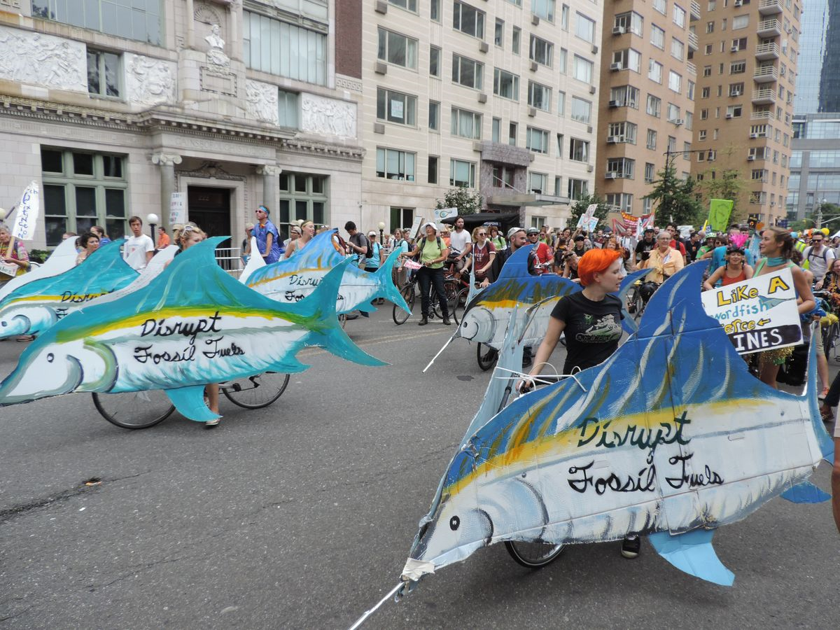 AR: And the groups included not only enviros like 350.org, NRDC, the Center for Biological Diversity, and Environmental Defense Fund, but also teachers’ unions, labor unions, nurses’ associations, farmers, indigenous peoples’ groups, marching bands, bicycle brigades (“the revolution will not be motorized”), floats, puppets, people on stilts spinning wind turbine blades, a melting ice sculpture that formed the words “Our Future,” people meditating in a climate vigil, students, monks, Old Lesbians Organizing for Change, Veterans for Peace, religious groups, social justice groups, scientists rolling a chalkboard with the science laid out (“The debate is over”), anti-fracking groups, anti-mountain top removal groups, anti-tar sands, pro-solar and pro-wind groups, people who lived through Hurricane Sandy and Typhoon Haiyan, old people, young people. I saw a toddler in a bicycle seat wearing a helmet made from a globe, people dressed as bees and bee-keepers holding huge tissue-paper flowers, people hanging banners out of windows above the streets, Ricoh’s “only solar-powered billboard in Times Square,” women in headscarves, the “Raging Grannies…”