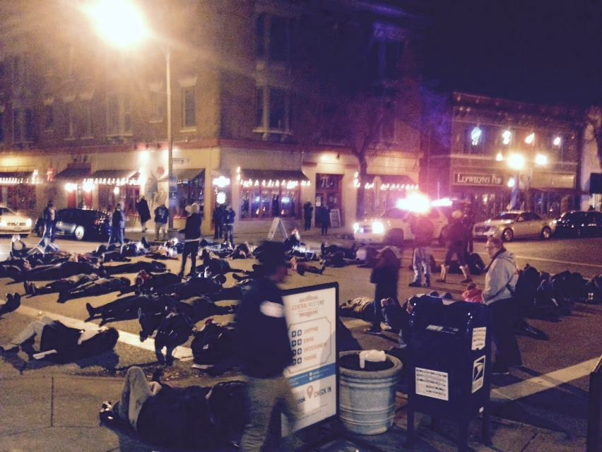 JS: Most of the protests have taken place outside of the Central West End [the store’s neighborhood], but there have been a few here recently, especially after the Mokabe’s and South Grand incident. On the 25th [of November], protesters demonstrated in the intersection of Euclid and Maryland, about a block away from the bookstore. On Black Friday, protesters shut down malls and interstates in the area. Most of the businesses shut their doors and closed when the protesters arrived, but we knew that was counter to what we knew to be true—that the vast majority of the protesters were angry, but not violent—so we made a conscious decision to, if protesters showed up, keep our doors open, lights on and windows unboarded. They did show up on our corner at around 9:50 PM, just before we closed, and staged a die-in on our corner. It was peaceful and actually pretty powerful. The scariest thing about it was the police, who outnumbered the protesters. Then, last night a group returned to the corner of Euclid and Maryland and started to protest again. A guy in an SUV ran into the crowd and hit some of the protestors and pulled out a gun. He was arrested and released. To sum up, the only violence during the CWE protests so far has come from someone who wasn’t protesting.