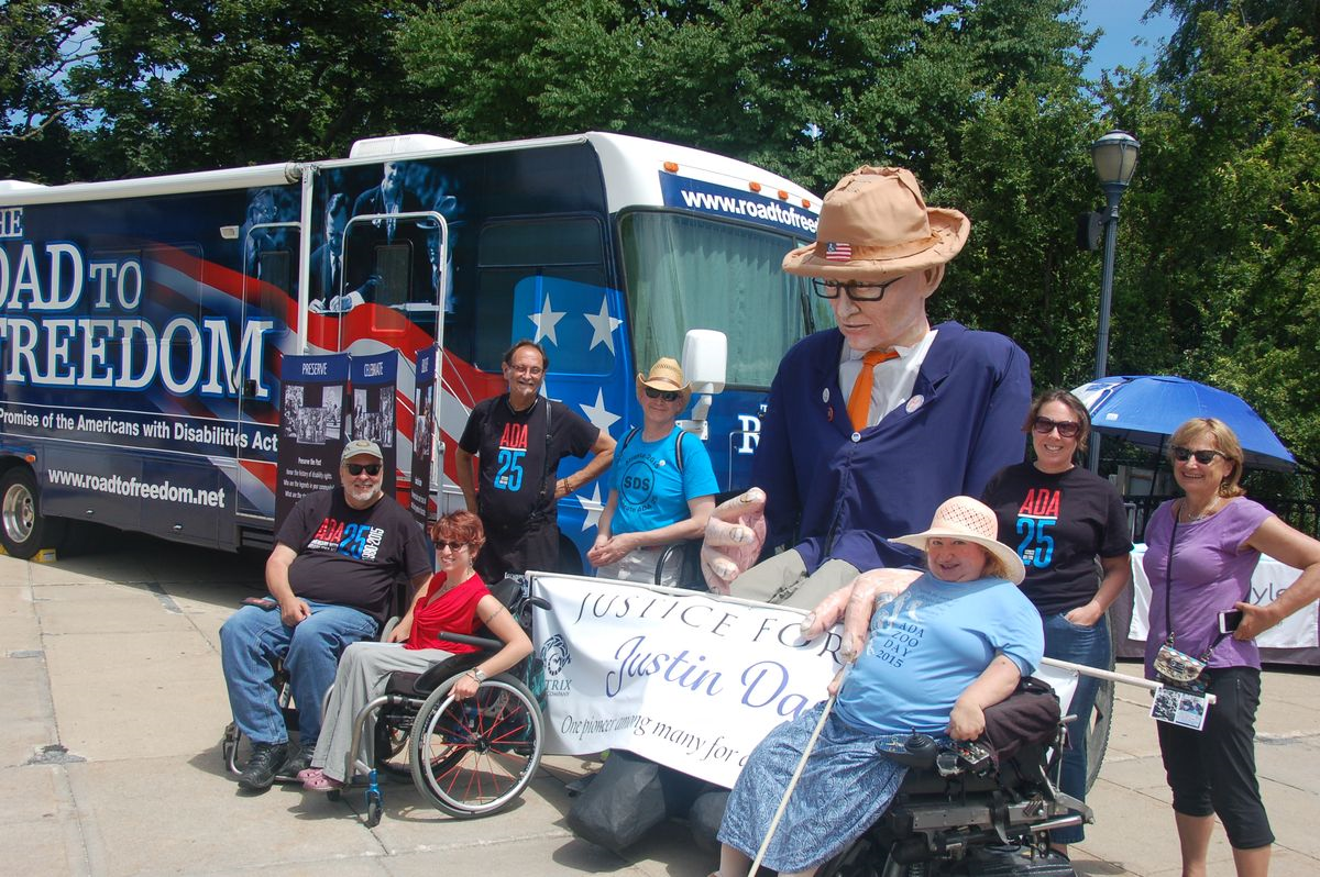 On July 26, we drove to DC once again and with thousands of others celebrated the twenty-fifth anniversary of the 1990 Americans with Disabilities Act (ADA) outside the Smithsonian Institution’s National Museum of American History. Once again we considered the Fourteenth Amendment’s equal protection clause. The passion and mischievousness of those who pushed for the legislation that protects the civil rights of people with disabilities, and then demanded its enforcement, thrilled us. We expressed anger that the Supreme Court we had cheered only months earlier had eroded the ADA’s strength over the last two decades, and breathed a sigh of relief that U.S. legislators had seen fit to reinforce its original intention in the 2008 ADA Amendments Act. We fell in love with the bite and creativity of the activists who have emerged during the last twenty-five years. Sincerity and disillusionment blended amongst the crowds, during meals with friends, and in my own thoughts as we pondered how to make democracy accessible to all. It eased my soul to hear once more, again and again, that segregation is a civil rights violation. Overwhelmed by the privileges and disadvantages embodied in D.C., we had really good food truck tacos.
