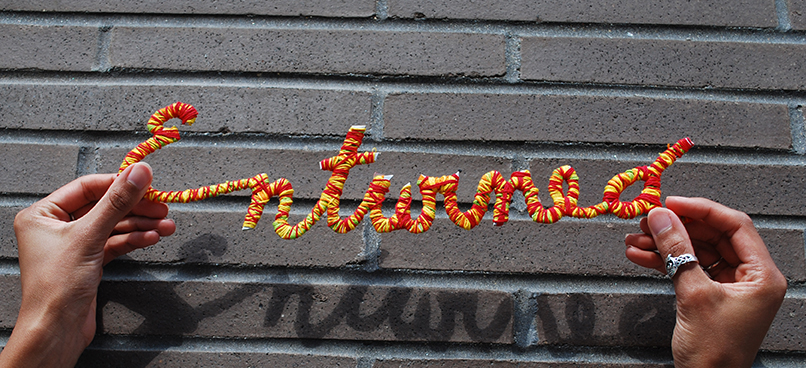 The fiber art of Judith Scott is vibrant, complex, and tactile. I felt like the title also needed a tactile and “entwined” treatment. I started with hand drawn text, trying to use lines to create movement and a sense of connection. I thought I was getting closer with the hand drawn text, but didn’t feel like I was quite there. This is when I thought of using some of my own embroidery thread to create the word “entwined” and mimic the texture and colors of the artwork by Judith Scott.