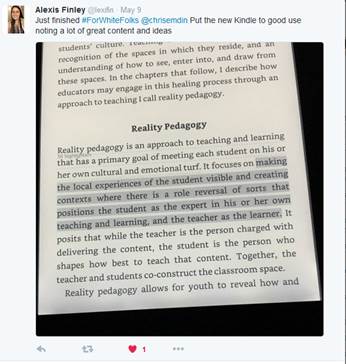 “Just finished #ForWhiteFolks @chrisemdin Put the new Kindle to good use noting a lot of great content and ideas.