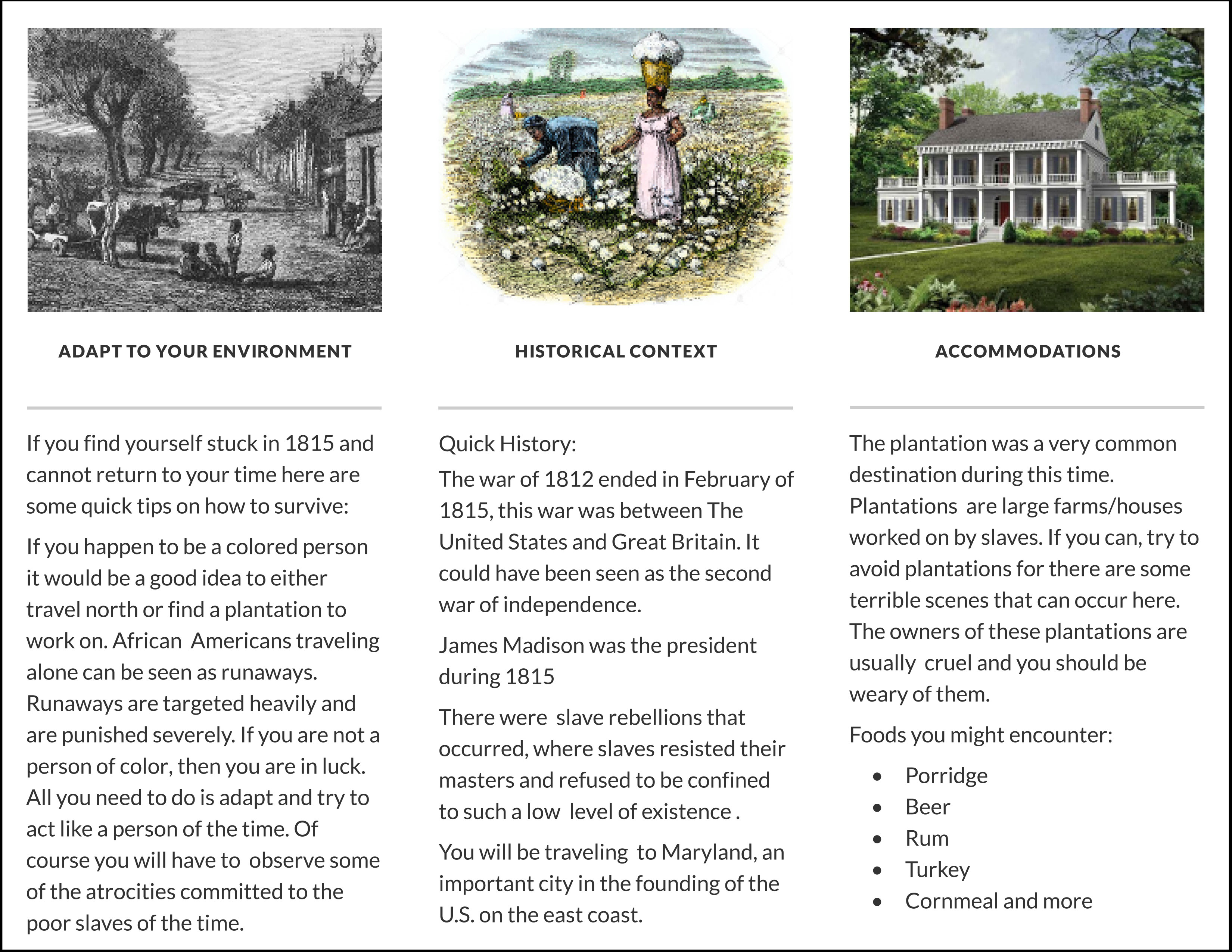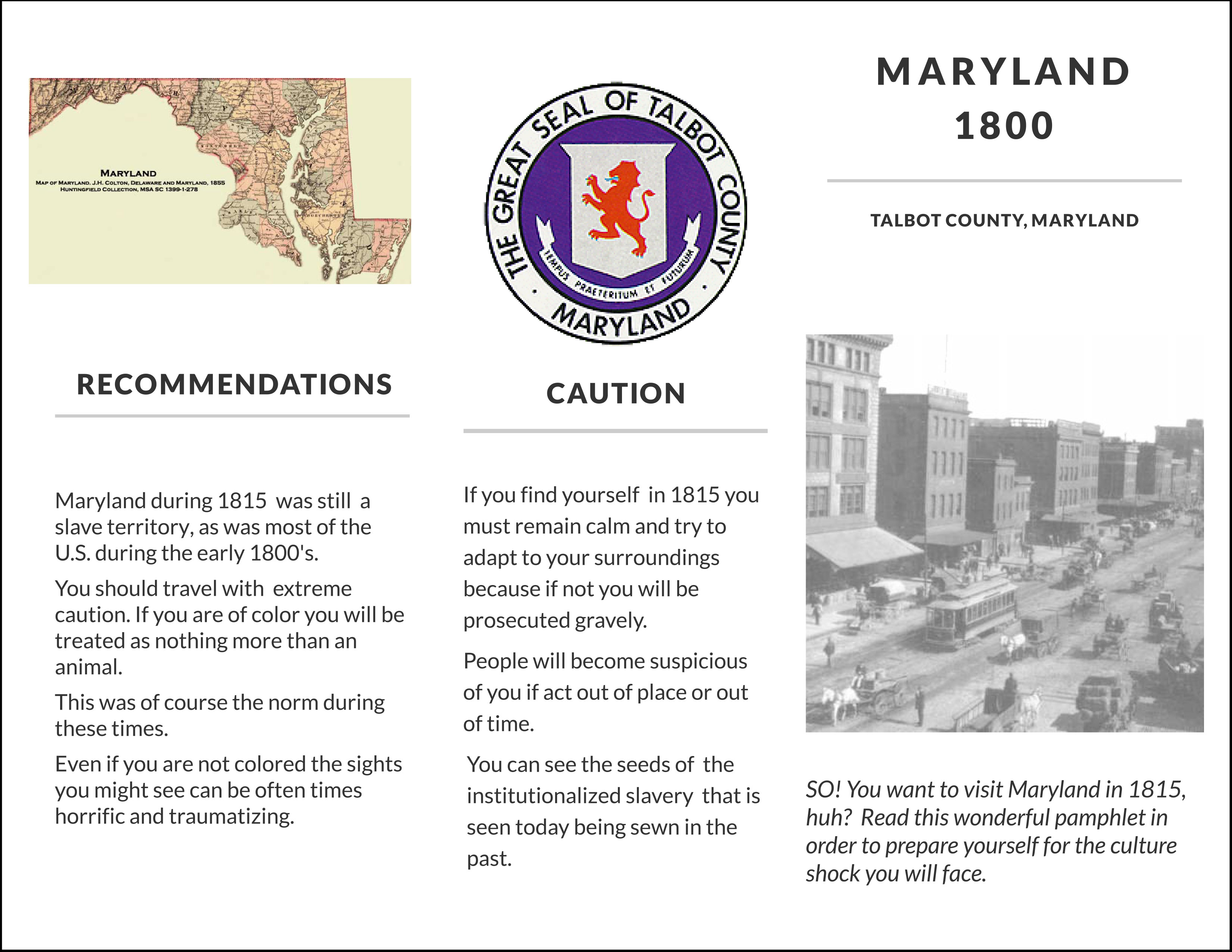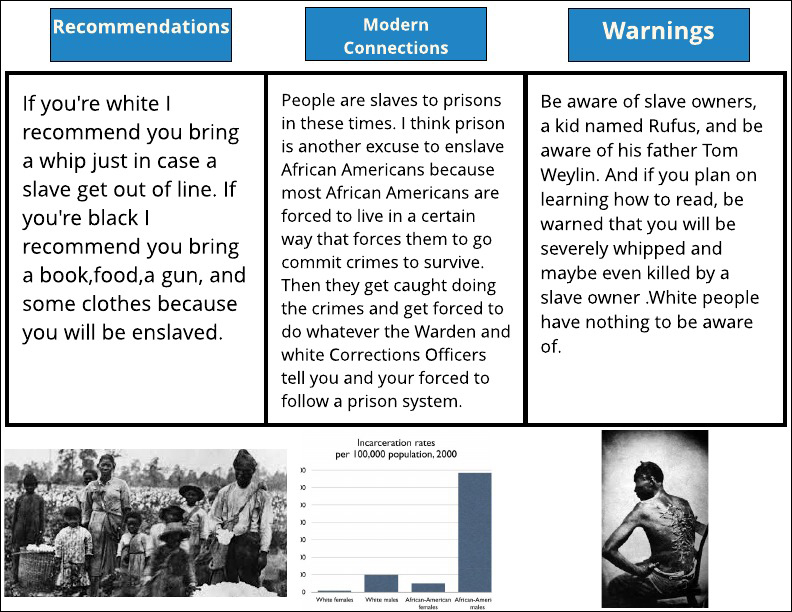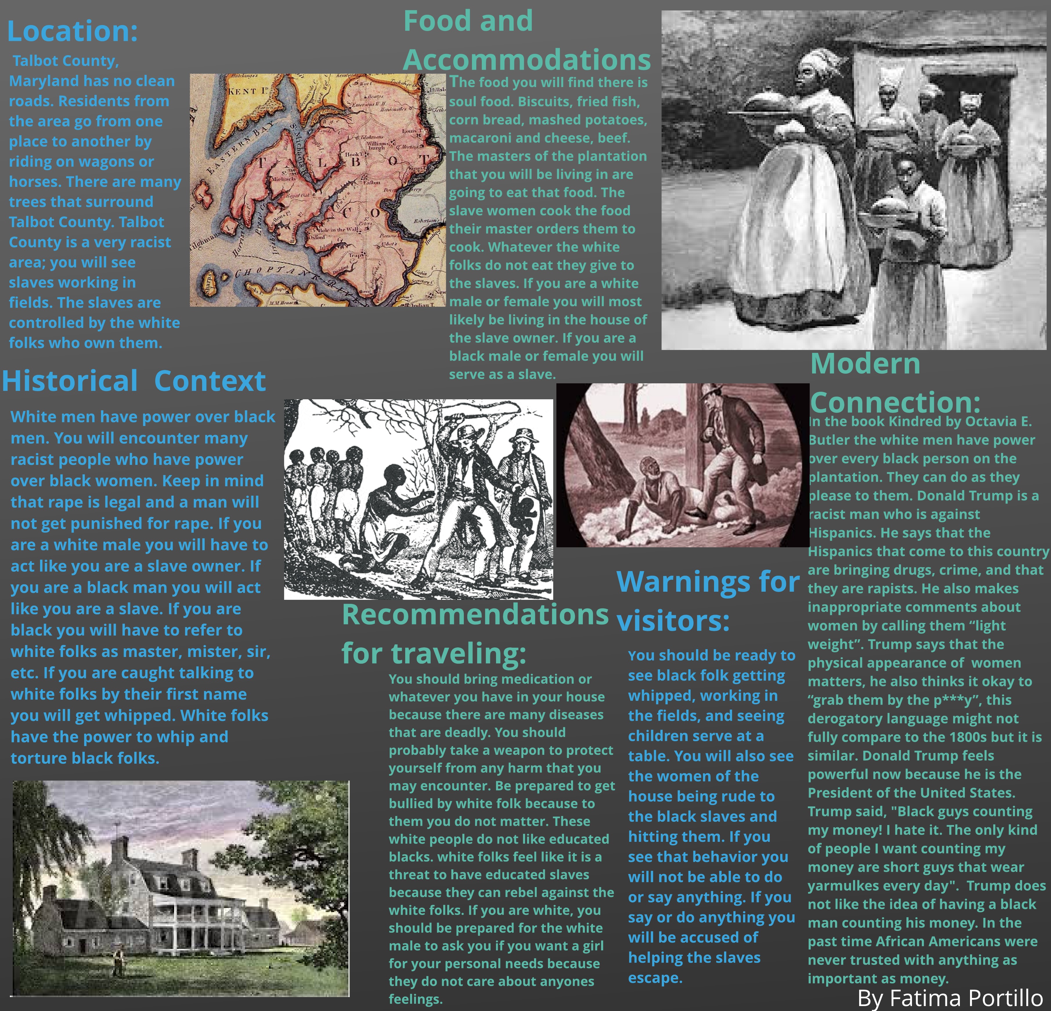 This secondary component of my classroom prompted me to reexamine the Kindred final project. This year, I asked students to create “Travel Guides to the Past.” I came to this project after examining and increasing my capacity for project-based learning in my classroom. I wanted students to become authors of potential time travel; therefore, they took on the voice of travel guide writers, and “advertised” nineteenth-century Maryland in order to turn advertisement into warning. The goal of the project is for students to distill the details of nineteenth-century Maryland as described by Octavia Butler and make connections between the contemporary moment and slavery’s legacy. This project requires them to practice literary analysis through close reading and synthesis. As authors of warnings of America’s white supremacist past, students became more able to identify and reflect on its lingering existence.