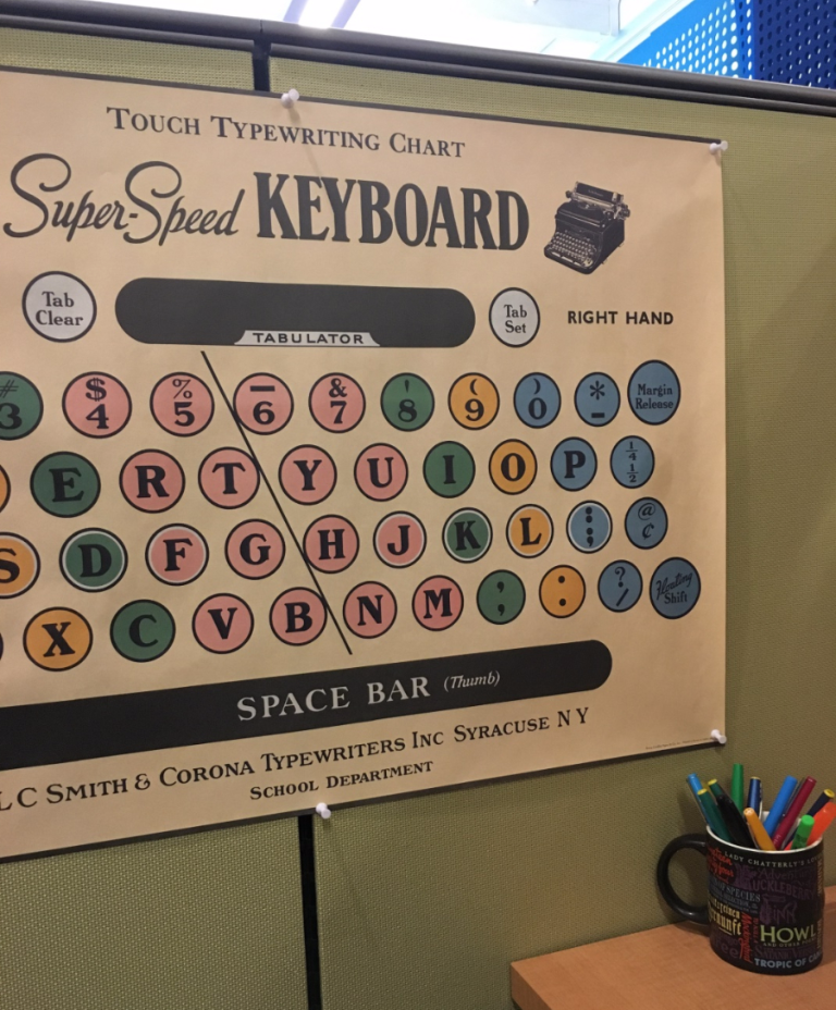 Typewriter poster and Banned Books mug—because, yeah. What else would an English major have at their desk?