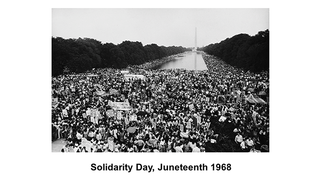 As we know, King was tragically assassinated on April 4, 1968. But Rev. Ralph Abernathy and SCLC were determined to see King’s vision through. By June 19 (“Juneteenth”), Solidarity Day for the campaign, a rainbow of poor people had erected Resurrection City on the Mall. This settlement of tents housed some 7,000 people.
