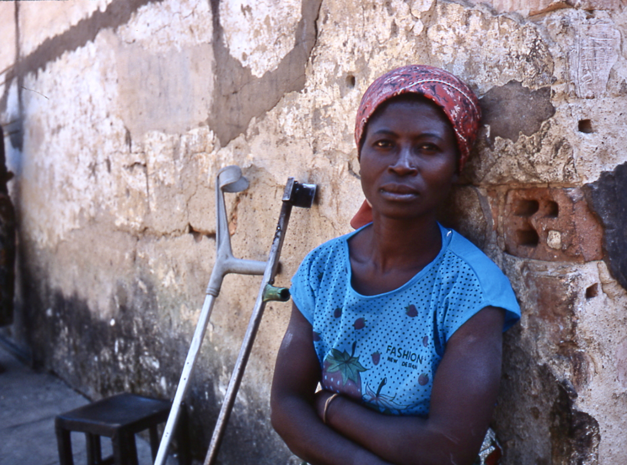 Chisola Jorgeta Pezo, outside the abandoned Luena railway station where she and other displaced lived, in 1996. An antipersonnel mine blasted off her right foot on June 2, 1990, while she was searching for cassava. She was age thirty-six at the time, with three children. Infection later required an above-the-knee amputation.