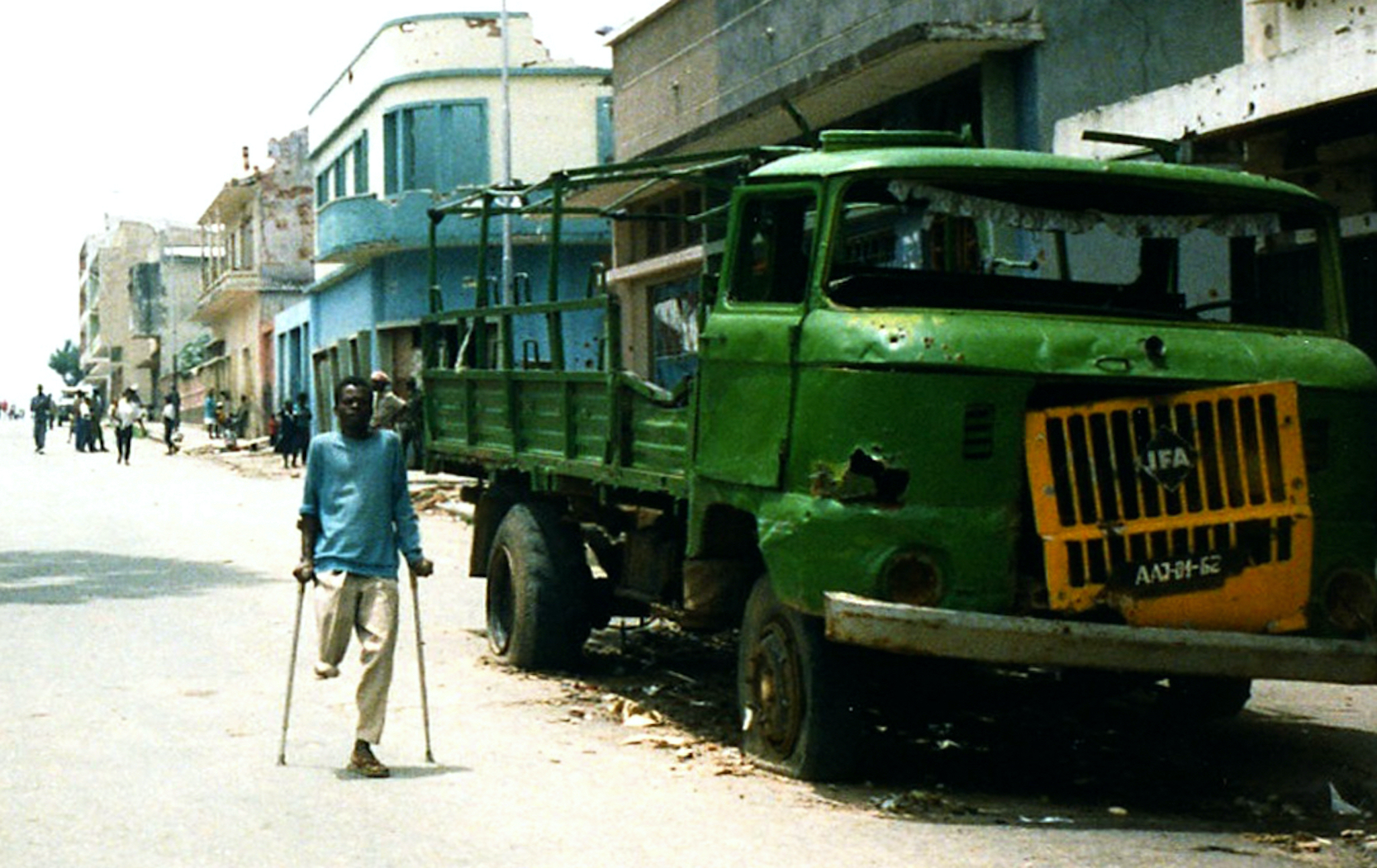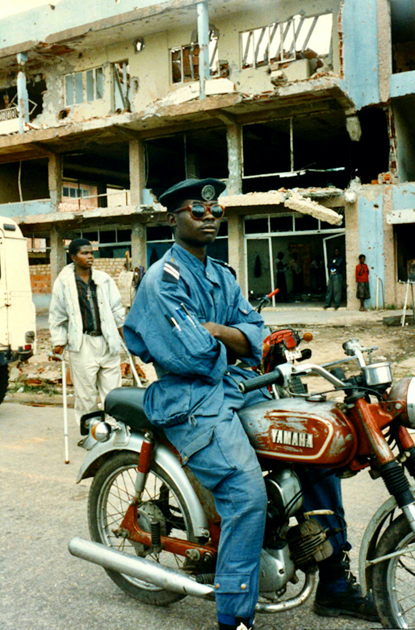 A police officer with nothing to police, during the siege of Kuíto, 1994. A mine amputee stands behind him.