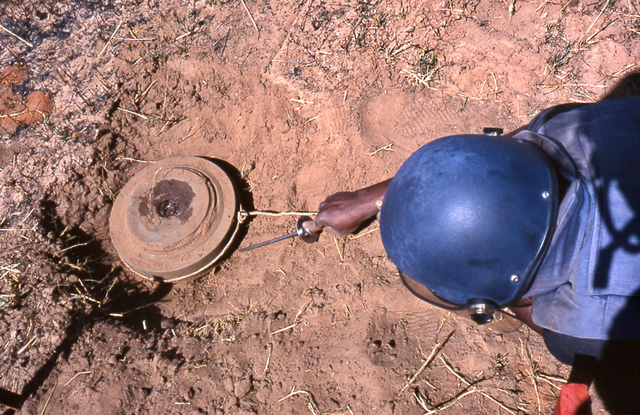 Francisco Muiengo, an engineer with the Mines Advisory Group, disarming a Romanian-made antipersonnel mine. A Russian anti-tank mine is visible underneath. Combatants often stacked the mines to maximize casualties.