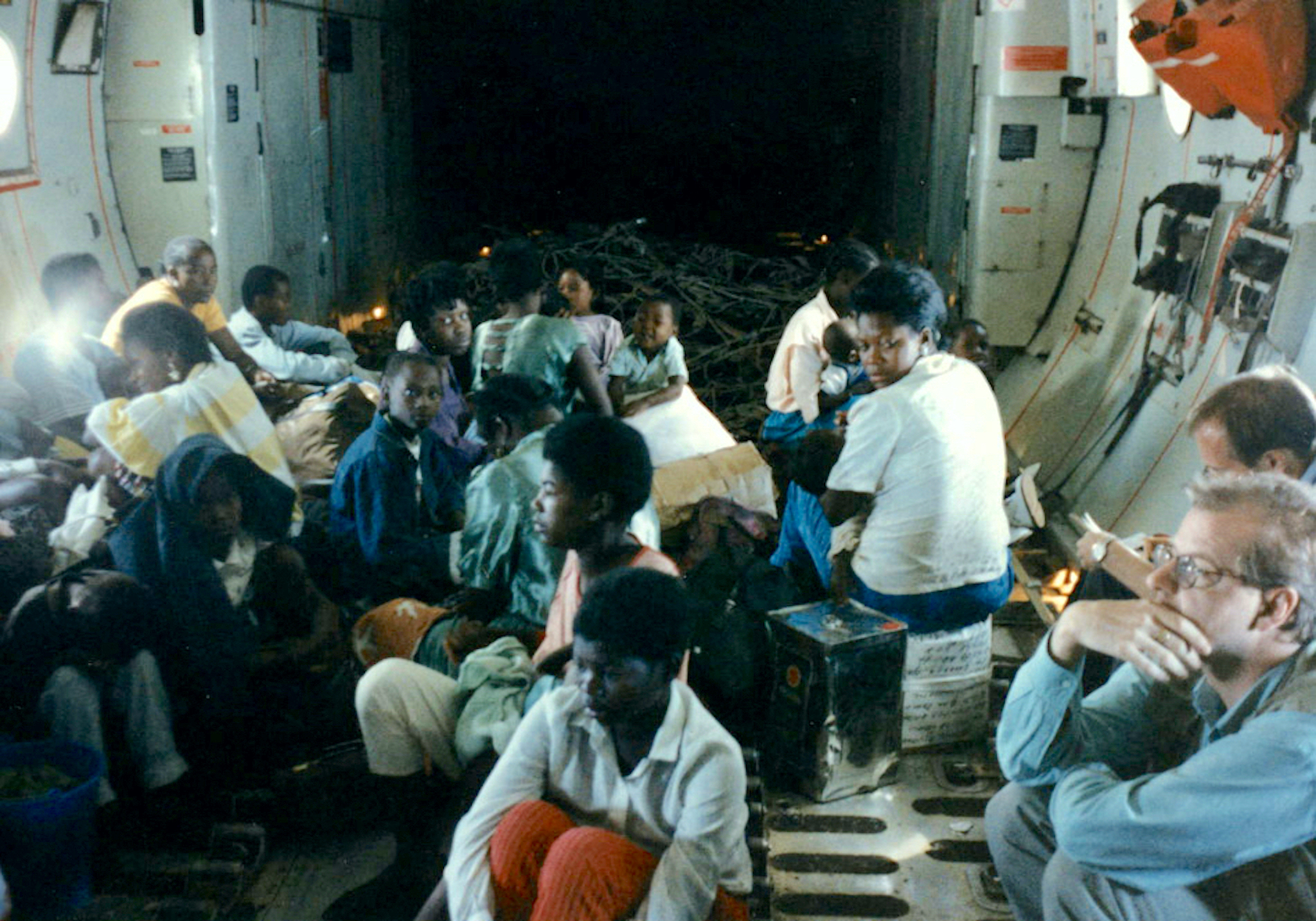 Wounded government soldiers, their families and a few journalists on a cargo flight from the highlands back to Luanda. In the forward hold lay a heap of broken weapons gathered from a battlefield. When the plane landed, the children on board inexplicably began whooping and smashing the broken weapons.